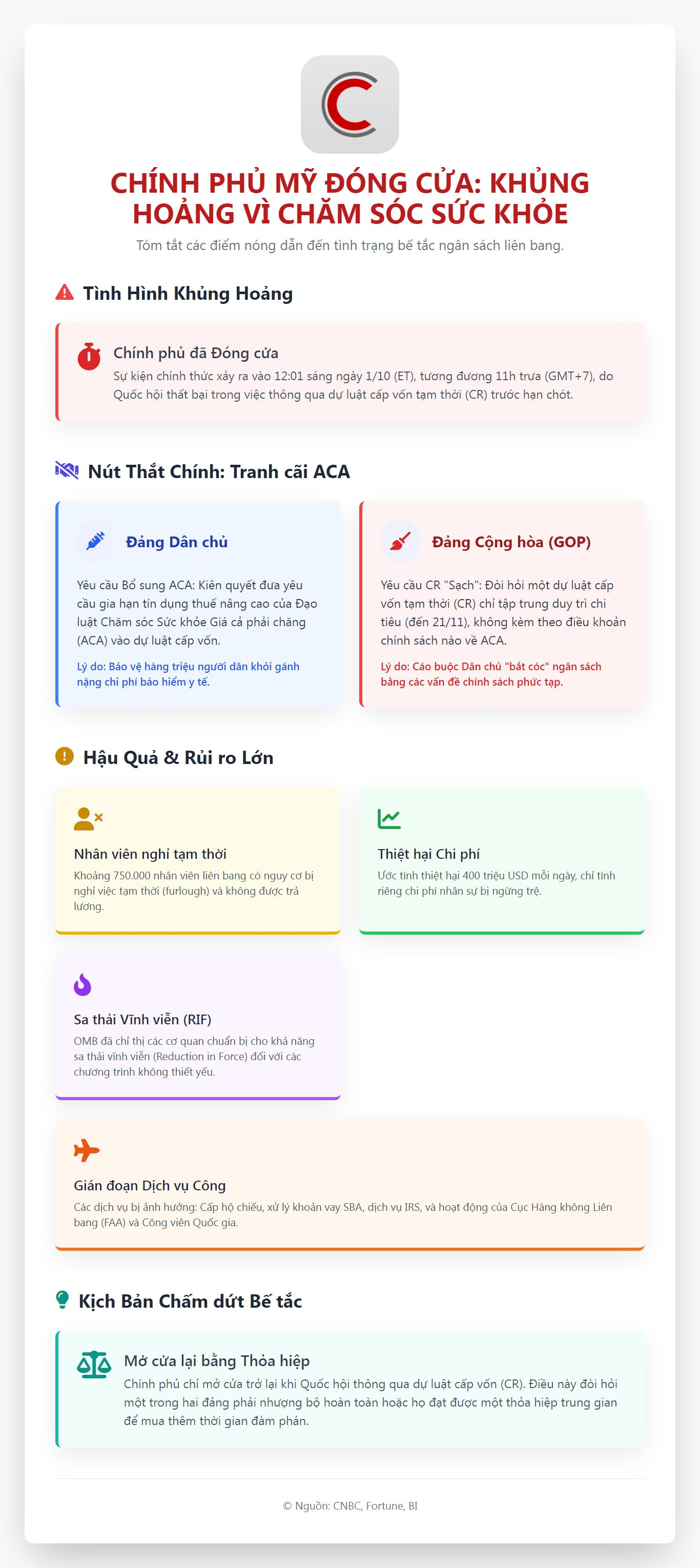 Đồng thời, sự kiện này cũng đánh dấu sự thất bại của Nghị viện trong việc thông qua dự luật cấp vốn tạm thời (Continuing Resolution - CR) trước hạn chót của năm tài khóa. Không chỉ là một sự cố hành chính, việc đóng cửa lần này là đỉnh điểm của một cuộc chiến chính trị gay gắt, nơi các vấn đề về ngân sách đã bị "bắt cóc" bởi cuộc tranh luận kéo dài về chăm sóc sức khỏe.
