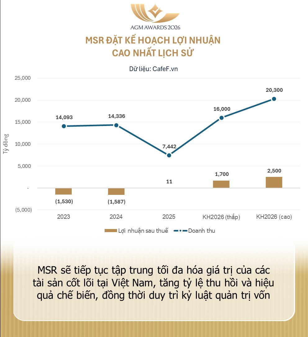 - Bước sang quý I/2026, giá APT đã vượt ngưỡng 3.100 USD/mtu, cao hơn đáng kể so với các kịch bản dự báo trước đó của thị trường. Nhờ đó, Quý I, MSR ghi nhận kết quả kinh doanh sơ bộ với doanh thu thuần ước đạt khoảng 2.993 tỷ đồng (tương đương 112 triệu USD). Lợi nhuận sau thuế ước đạt 537 tỷ đồng (tương đương 20 triệu USD), vượt xa lợi nhuận của cả năm 2025.