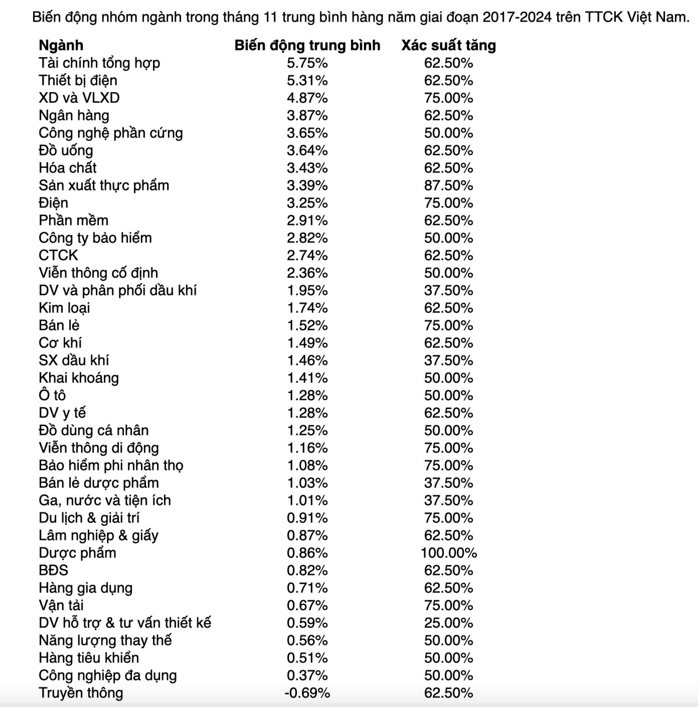 Xét theo từng nhóm ngành trên thị trường chứng khoán Việt Nam giai đoạn 2017–2024, chuyên gia Yuanta cho rằng tháng 11 thường chứng kiến sự phân hóa rõ rệt. Theo đó, tài chính tổng hợp, thiết bị điện và xây dựng - vật liệu xây dựng là ba nhóm dẫn đầu về mức tăng trung bình trong tháng 11, đạt từ 4,87%-5,75%.