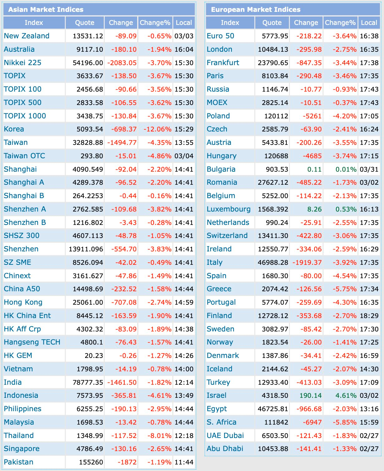 Một đợt bán tháo trên diện rộng đang diễn ra trên khắp các thị trường chứng khoán châu Á khi các nhà đầu tư đối mặt với sự bất ổn ngày càng tăng về thời gian và tác động của tình hình căng thẳng tại Trung Đông. Theo các nhà phân tích, Thái Lan là một trong những nền kinh tế dễ bị tổn thương nhất trong khu vực trước giá dầu tăng cao do xung đột gây ra, bởi vì nước này nhập khẩu năng lượng rất lớn.