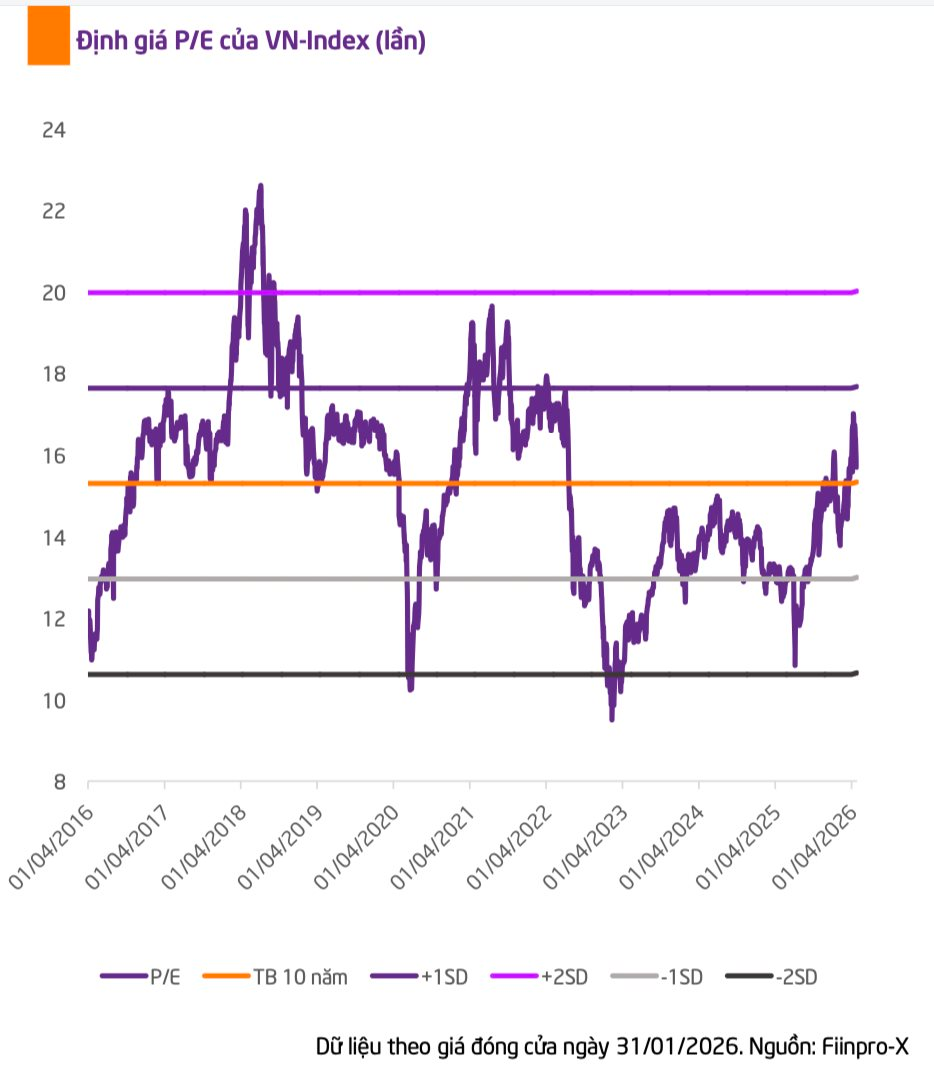 Bên cạnh đó, câu chuyện nâng hạng thị trường tiếp tục là động lực quan trọng. FTSE Russell dự kiến công bố kết quả chính thức về khả năng nâng hạng thị trường chứng khoán Việt Nam vào tháng 3/2026. Nếu được nâng hạng, thị trường có thể mở ra dư địa để P/E quay trở lại mức trung bình 10 năm, tương tự các giai đoạn tăng trưởng mạnh trước đây như 2017–2018 và 2020–2021.