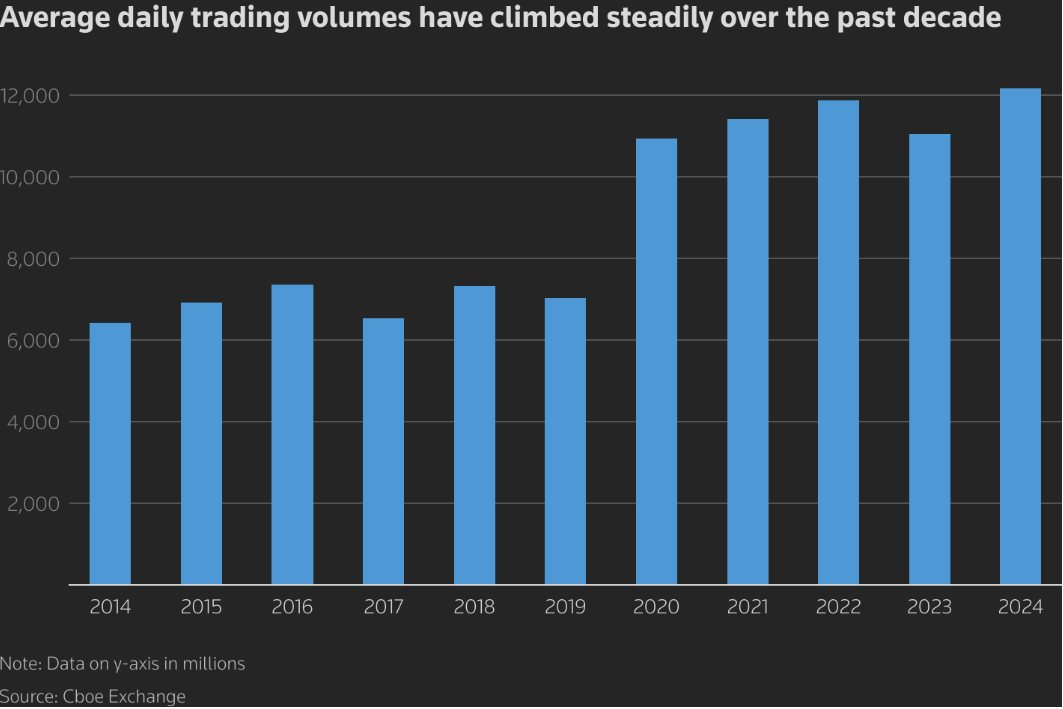 Khối lượng giao dịch trung bình hàng ngày đã tăng đều đặn trong thập kỷ qua. Thị trường chứng kiến khối lượng giao dịch tăng đột biến, đạt đỉnh điểm vào tháng 10.