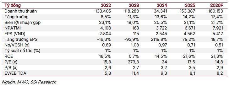 Đối với mảng sản phẩm công nghệ và điện máy, SSI cho rằng nhu cầu thay mới điện thoại, laptop và các chính sách giảm thuế sắp triển khai sẽ tiếp tục hỗ trợ tăng trưởng lợi nhuận. Nhờ kết quả kinh doanh quý III vượt kỳ vọng, SSI điều chỉnh tăng dự báo lợi nhuận 2025–2026.