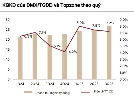 Quý 3/2025, MWG ghi nhận kết quả kinh doanh ở mức cao kỷ lục mới với doanh thu đạt 39.900 tỷ đồng, tăng 17% so với cùng kỳ và 6% so với quý trước. Lợi nhuận ròng đạt 1.780 tỷ đồng, tăng tới 121% so với cùng kỳ và 8% so với quý trước.
