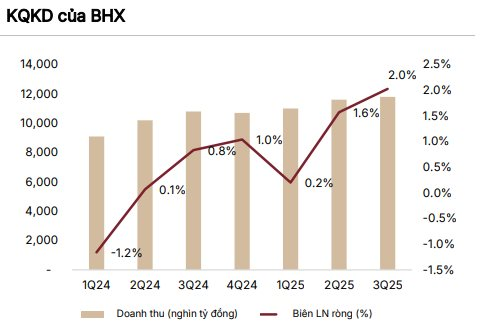 Đối với Bách Hóa Xanh, SSI kỳ vọng chuỗi bách hóa sẽ hưởng lợi lớn từ thay đổi chính sách thuế áp dụng cho hộ kinh doanh cá thể, chuyển từ thuế khoán sang thu thuế theo doanh thu. Chính sách này được cho là sẽ thúc đẩy nhanh xu hướng dịch chuyển từ bán lẻ truyền thống sang bán lẻ hiện đại. BHX đã cải thiện biên lợi nhuận trong quý III/2025, qua đó giúp SSI nâng dự báo lợi nhuận giai đoạn 2025–2026.