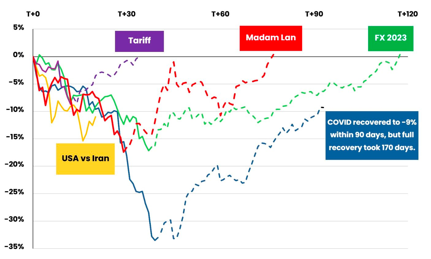 Quỹ ngoại đã tổng hợp các sự kiện thị trường từ năm 2020–2026. Các sự kiện được sắp xếp theo thứ tự thời gian, gồm (1) Sự bùng phát dịch COVID; (2) Vụ bắt giữ bà Trương Mỹ Lan; (3) Ngân hàng Nhà nước thắt chặt thị trường tiền tệ; (4) Việc công bố biểu thuế của Tổng thống Mỹ Donald Trump và; (5) Các cuộc tấn công của Mỹ và Israel vào Iran.