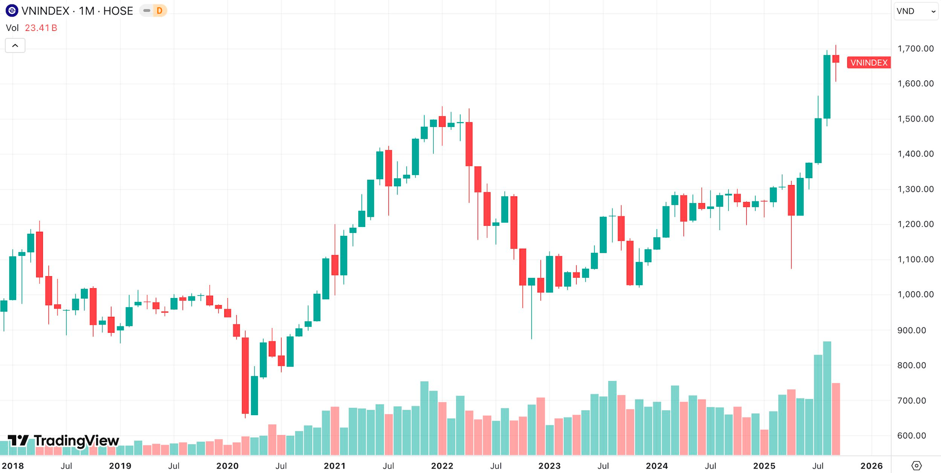 Trong 4 tháng trước đó, VN-Index đã tăng hơn 450 điểm, tương đương khoảng 37%. Thị trường miệt mài đi lên mà không có giai đoạn điều chỉnh nào thực sự rõ ràng. Các nhịp nghỉ cũng diễn ra ngắn ngủi vài phiên. Vì thế, áp lực chốt lời quanh vùng đỉnh 1.700 điểm là điều không thể tránh khỏi.