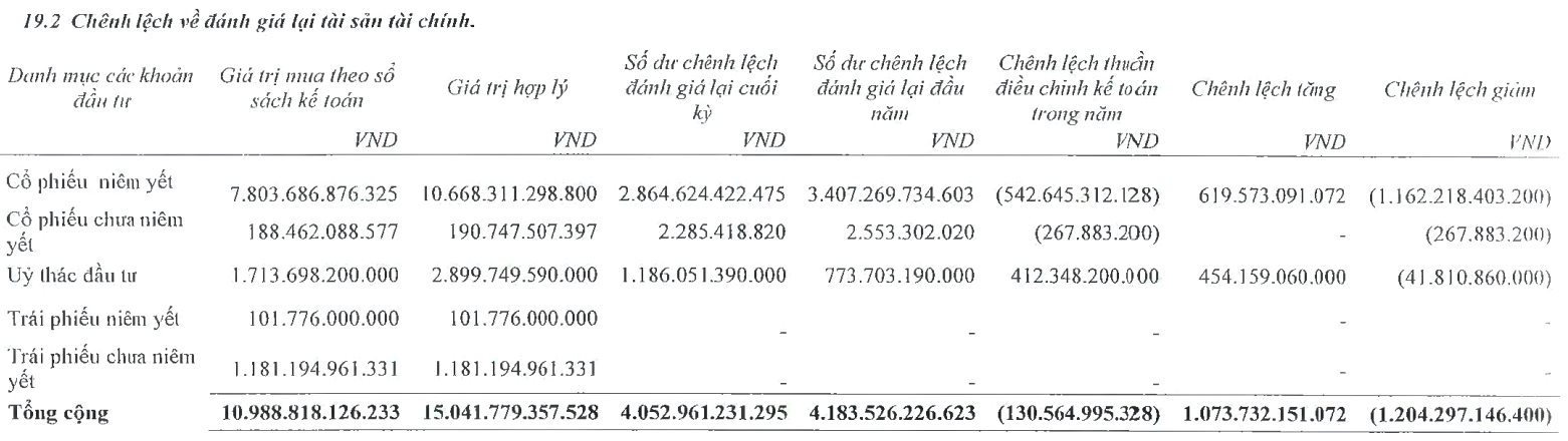 Giá trị hợp lý của danh mục này ghi nhận ở mức hơn 15.041,7 tỷ đồng, cao hơn giá trị ghi sổ, song phần chênh lệch đánh giá lại trong kỳ lại âm hơn 130,5 tỷ đồng. Đồng thời, tổng chênh lệch giảm giá lên tới hơn 1.204,2 tỷ đồng, vượt đáng kể mức chênh lệch tăng khoảng 1.073,7 tỷ đồng.