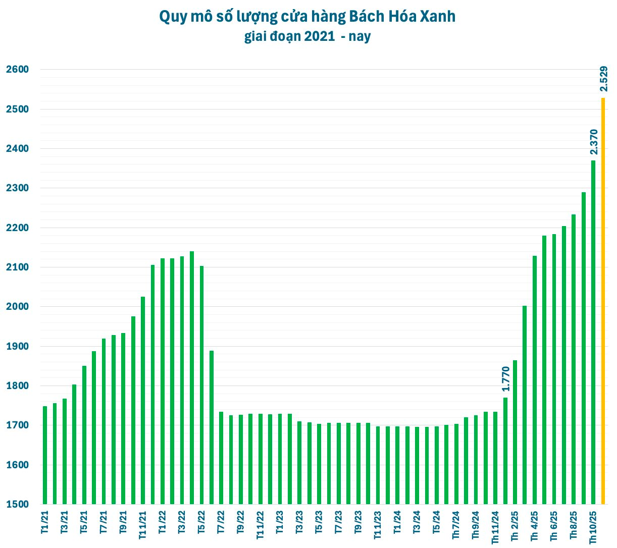 Theo cập nhật trên website bachhoaxanh.com, chuỗi siêu thị bán lẻ thực phẩm và hàng tiêu dùng Bách Hóa Xanh (BHX) hiện có đến 2.529 cửa hàng, con số kỷ lục kể từ khi hoạt động. Tính từ cuối tháng 10 đến nay, BHX đã mở thêm 159 cửa hàng sau khoảng 1 tháng rưỡi, tức là trung bình mỗi ngày mở mới 3 cửa hàng.
