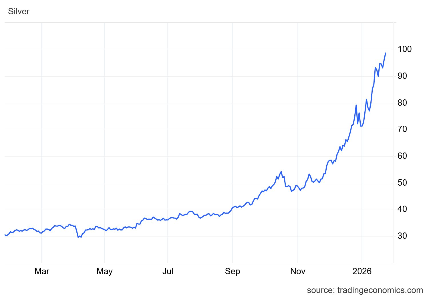 Chỉ trong tháng đầu tiên của năm mới, giá bạc đã tăng 31%, sau khi tăng gần 150% trong năm 2025. Kim loại quý này đang hưởng lợi lớn khi nhu cầu đầu tư tăng mạnh cùng với mức tiêu thụ công nghiệp cao, trong khi nguồn cung vật chất ngày càng khan hiếm. Tuy nhiên, theo Ibrahim, cơn sốt đầu cơ đã trở thành động lực chính của đợt tăng giá này và có thể không bền vững.