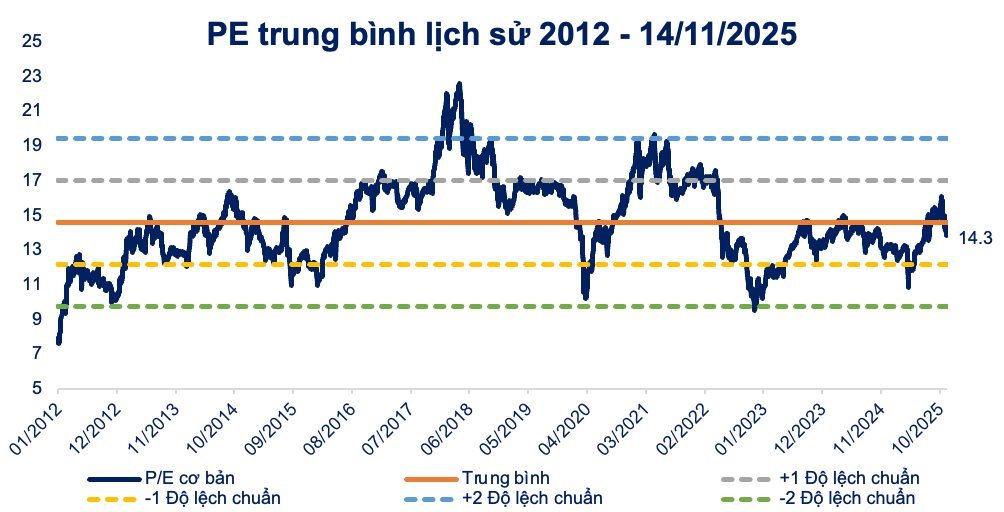 Về cấu trúc danh mục, chuyên gia khuyến nghị nhà đầu tư có thể chia thành ba “lớp” với vai trò khác nhau. Lớp lõi (core) khoảng 30–40% nên dành cho các doanh nghiệp đầu ngành, bảng cân đối lành mạnh, hưởng lợi từ câu chuyện tăng trưởng trung hạn 2025–2026: một số ngân hàng chất lượng, cổ phiếu tiêu dùng thiết yếu, tiện ích, và một phần ở nhóm công nghệ – hạ tầng số. Đây là các nhóm được nhiều tổ chức đánh giá vẫn còn upside hợp lý khi VN-Index đang giao dịch quanh P/E khoảng ~14 lần, không còn quá rẻ nhưng vẫn chấp nhận được nếu lợi nhuận duy trì tăng trưởng.