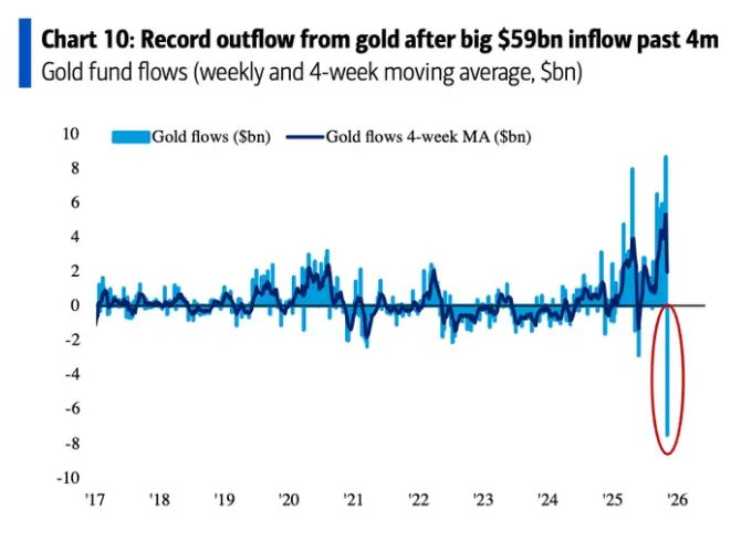 Biểu đồ thứ hai của BofA cho thấy nhà đầu tư đang thu về lợi nhuận từ vàng, sau khi giá kim loại quý này tăng mạnh lên mức cao kỷ lục rồi giảm vào đầu tháng 10. Động thái rút vốn nhanh có thể được coi là giai đoạn “thiết lập lại”, mở đường cho chu kỳ tăng mới nếu áp lực chốt lời giảm và nhà đầu tư quay lại coi vàng là công cụ phòng vệ biến động thị trường.