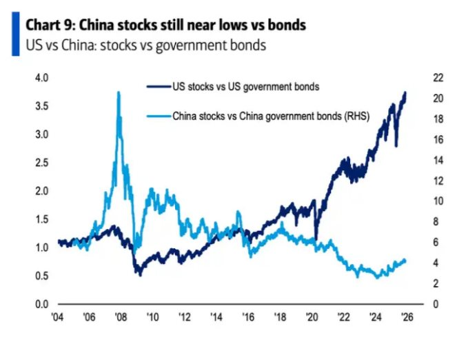 Trong biểu đồ đầu tiên của Bank of America, thị trường Mỹ vẫn thể hiện rõ khẩu vị rủi ro, trong khi cổ phiếu Trung Quốc đang giao dịch gần vùng thấp tương đối so với trái phiếu. Theo ngân hàng này, bối cảnh đó có thể mở ra tiềm năng tăng giá nếu niềm tin vào triển vọng kinh tế Trung Quốc phục hồi trong thời gian tới.