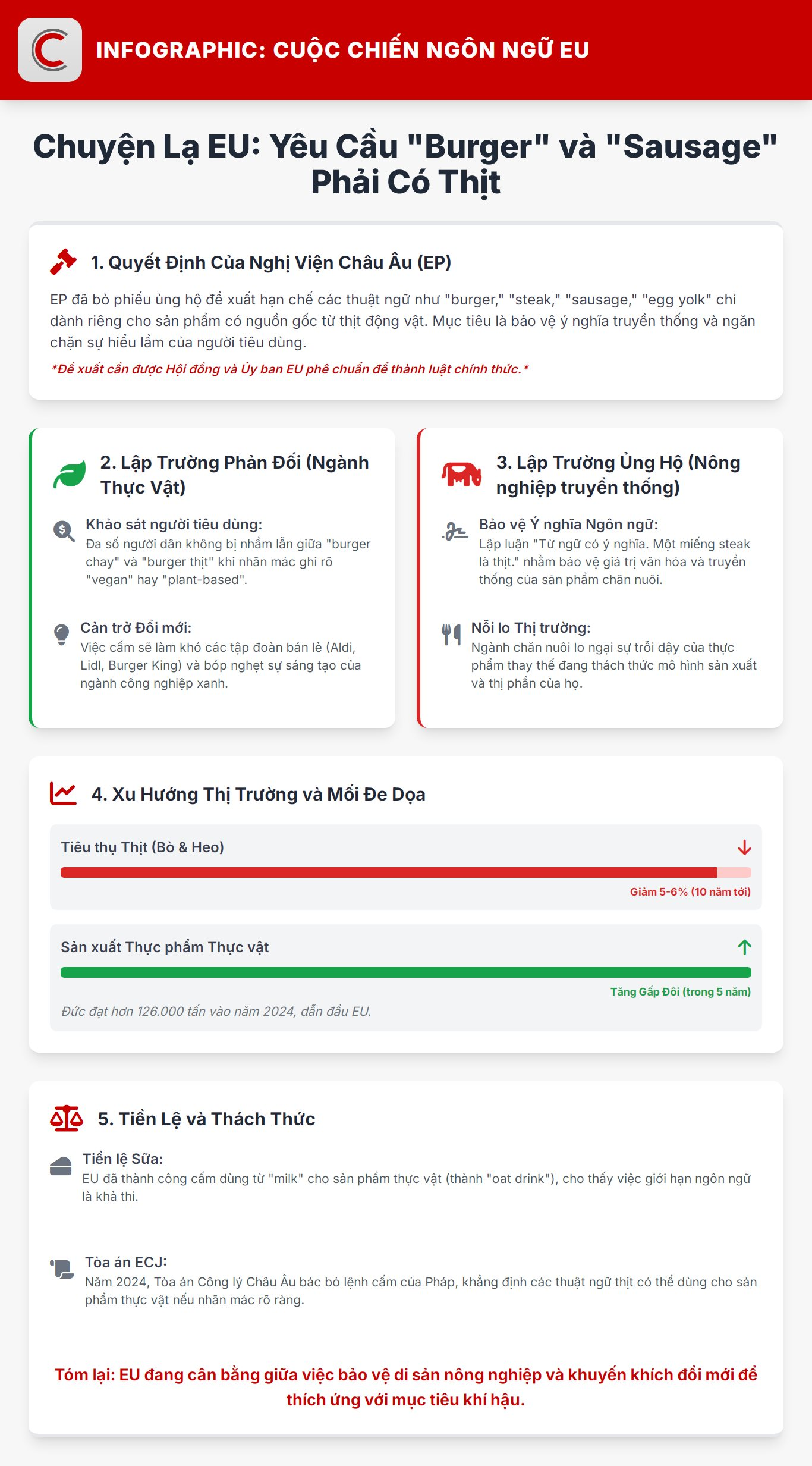 Cuộc chiến ngôn từ này không phải mới. Năm 2021, Pháp từng ra sắc lệnh cấm dùng từ “steak” hay “saucisse” (xúc xích) cho sản phẩm chay, nhưng bị Tòa án Công lý châu Âu bác bỏ vì vi phạm quyền thương mại tự do trong khối.