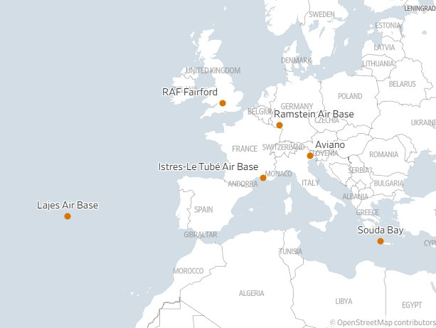 Căn cứ không quân Lajes (Bồ Đào Nha), trên đảo Terceira thuộc quần đảo Azores, đóng vai trò là trung tâm hậu cần quan trọng cho các hoạt động của Mỹ và gần đây đã tiếp đón hàng chục máy bay tiếp nhiên liệu của Mỹ.