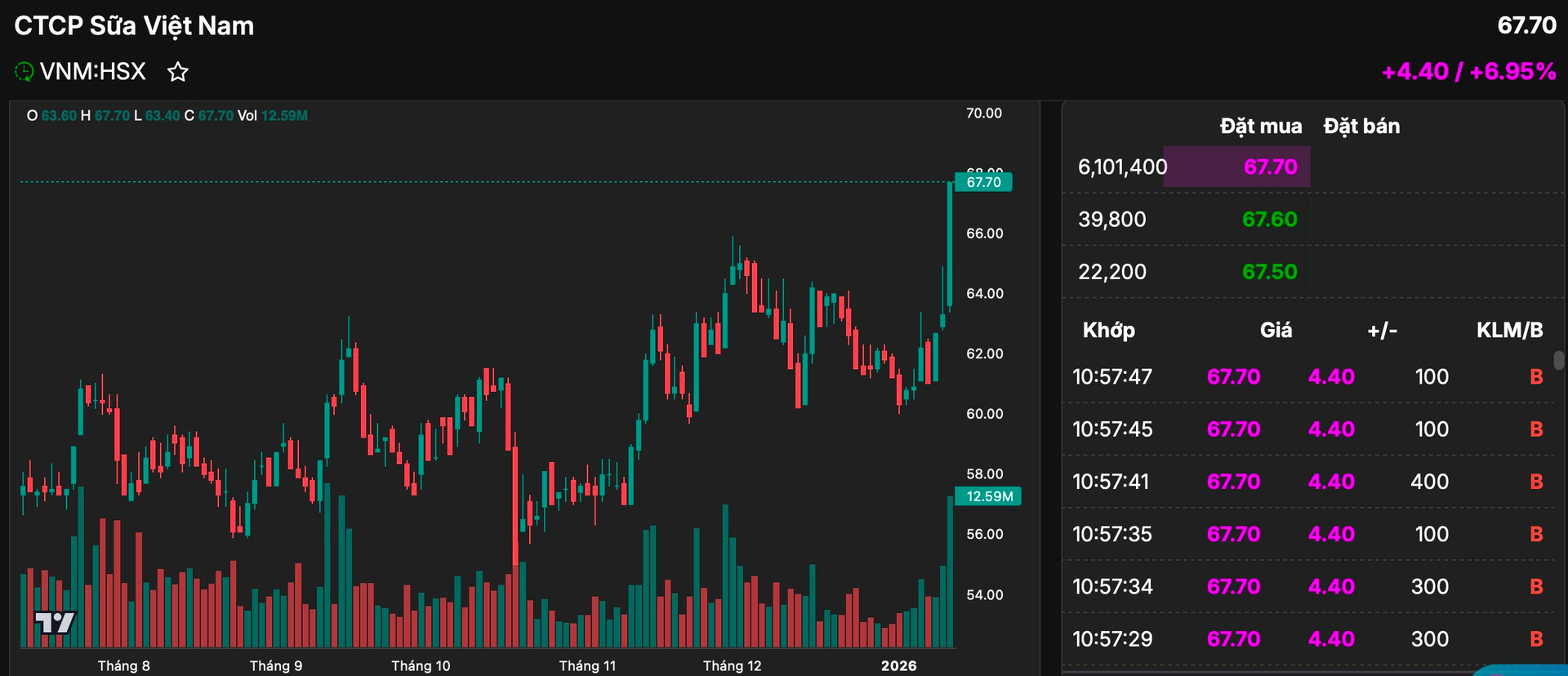 Ngay sau khi cổ đông Nhà nước thông báo chưa thể thoái bớt vốn, cổ phiếu Vinamilk đã bất ngờ tăng kịch trần “trắng bên bán” phiên 13/1 lên mức 67.700 đồng/cp, cao nhất kể từ tháng 9/2023. Vốn hóa thị trường tương ứng hơn 140.000 tỷ đồng.