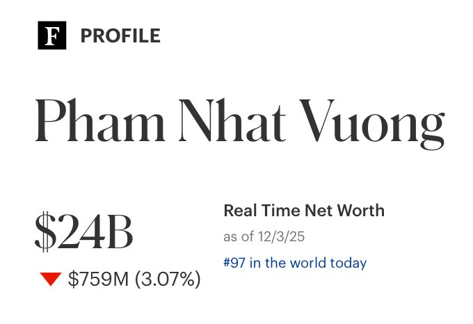 Cổ phiếu Vingroup bốc đầu đẩy tài sản của tỷ phú Phạm Nhật Vượng tăng vọt. Theo cập nhật từ Forbes, tính đến ngày 3/12, Chủ tịch Vingroup có khối tài sản 24 tỷ USD, nằm trong top 100 người giàu nhất thế giới. Đây là lần đầu tiên trong lịch sử một người Việt Nam lọt vào danh sách này của Forbes.