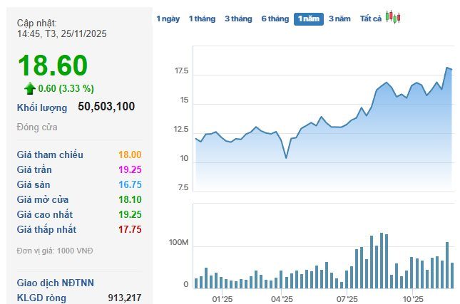 So với đầu năm 2025, thị giá HAG đã tăng hơn 54%, vốn hóa doanh nghiệp leo lên ngưỡng 23.573 tỷ đồng. Đặc biệt thanh khoản tại cổ phiếu này trở nên sôi động đáng kể. Phiên 25/11 ghi nhận hơn 50,5 triệu đơn vị được giao dịch – mức cao nhất trong vòng 2 năm trở lại đây, tương ứng giá trị gần 946 tỷ đồng.