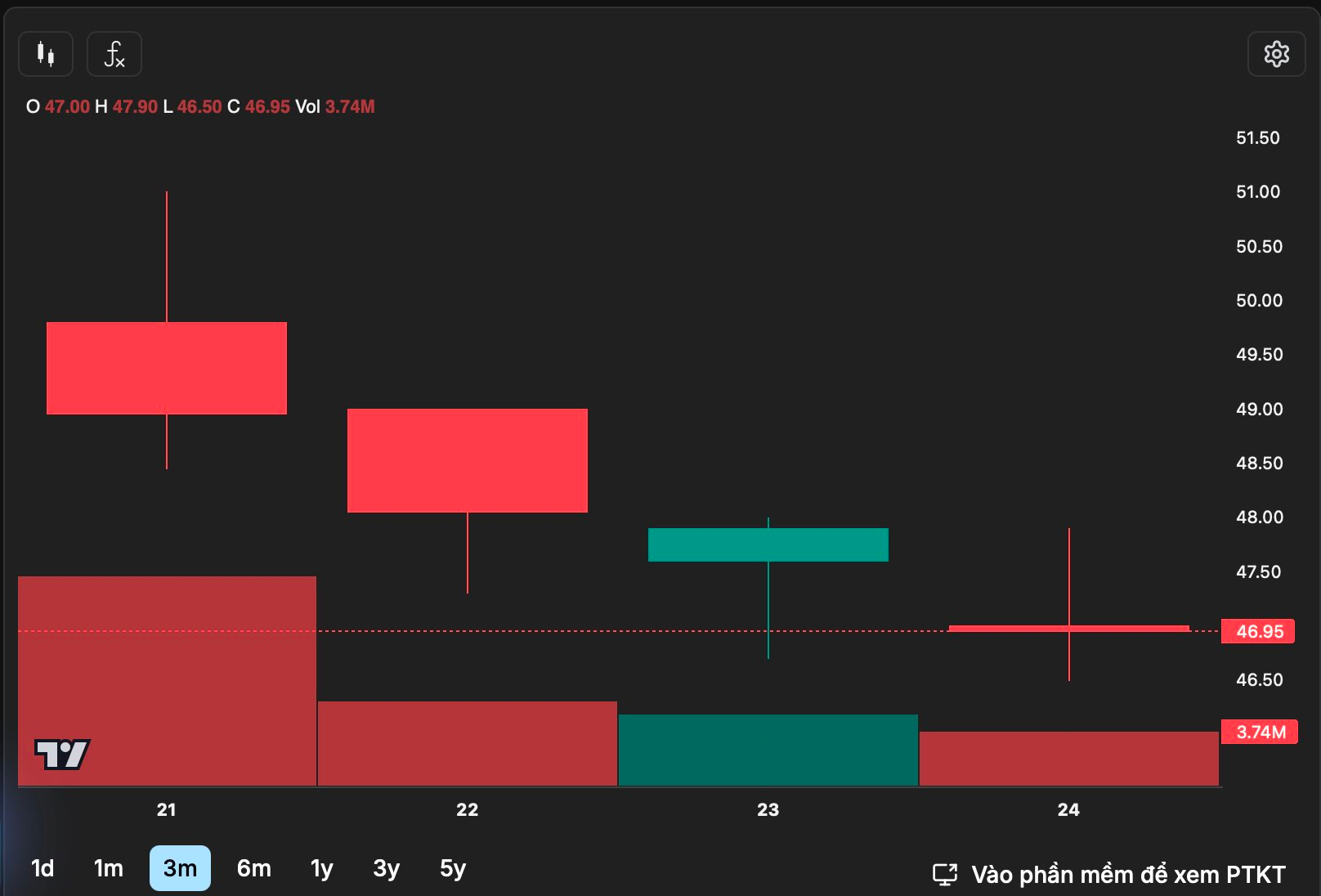 Sau khi chào sàn rực rỡ ngày 21/10 và có lúc chạm mốc 51.000 đồng, cổ phiếu TCX của Chứng khoán Techcombank (TCBS) đã giảm mạnh 3 phiên liên tiếp sau đó. Đóng cửa phiên 24/10, thị giá TCX dừng ở mức 46.950 đồng/cp, gần sát với giá IPO (46.800 đồng/cp). Nhà đầu tư mua đợt IPO hiện gần như không có lãi.