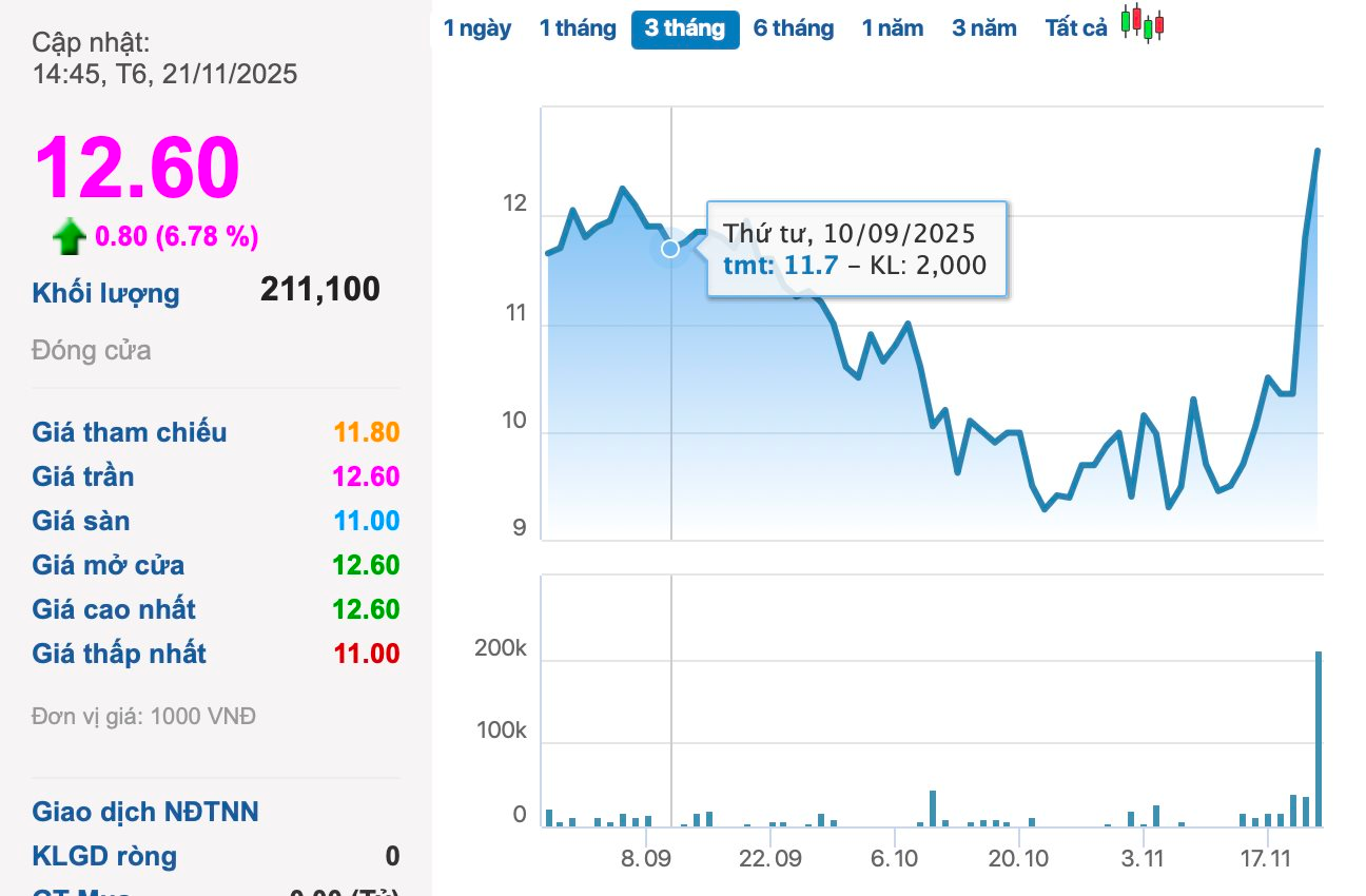 Chốt phiên 21/11, cổ phiếu TMT của CTCP Ô tô TMT tiếp tục tăng kịch biên độ, ghi nhận chuỗi 4 phiên tăng trần liên tiếp. Thị giá tăng tốc lên 12.600 đồng/cp, tương ứng mức tăng gần 30% chỉ sau một tuần.
