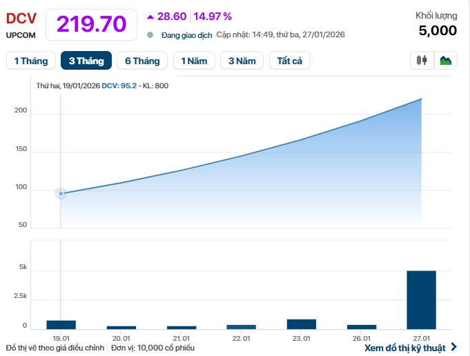 Trước đó, ngày 19/1, DCV chính thức có phiên giao dịch đầu tiên trên UPCOM với giá khởi điểm 68.000 đồng/cổ phiếu. Kể từ thời điểm đó, cổ phiếu này liên tục phủ kín sắc tím suốt 7 phiên liên tiếp, thị giá tăng vọt gấp 3,2 lần, Trên bảng điện, hàng chục nghìn cổ phiếu xếp hàng chờ mua giá trần, trong khi lượng khớp lệnh mỗi phiên chỉ đếm trên đầu ngón tay.