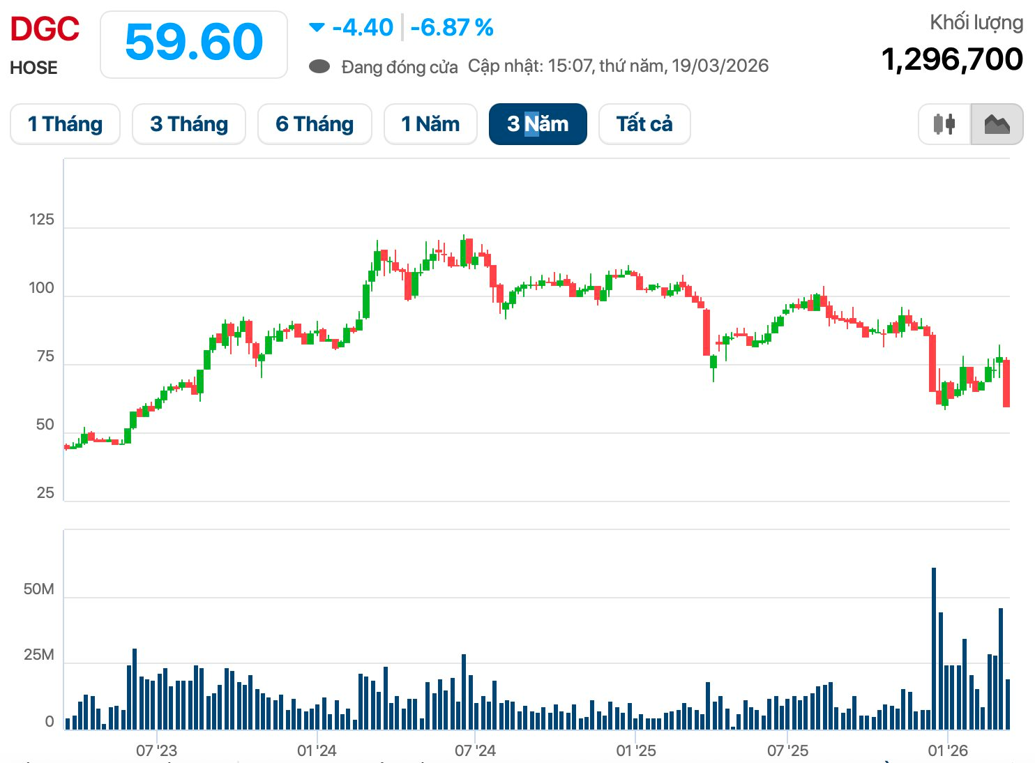 Sau 5 phiên giảm mạnh liên tiếp, cổ phiếu DGC của Hóa chất Đức Giang đã rơi xuống dưới 60.000 đồng/cp, thấp nhất trong gần 3 năm kể từ tháng 7/2023. Vốn hóa thị trường cũng theo đó “bốc hơi” 8.000 tỷ, chỉ còn chưa đến 23.000 tỷ đồng và không còn nằm trong nhóm doanh nghiệp tỷ USD.