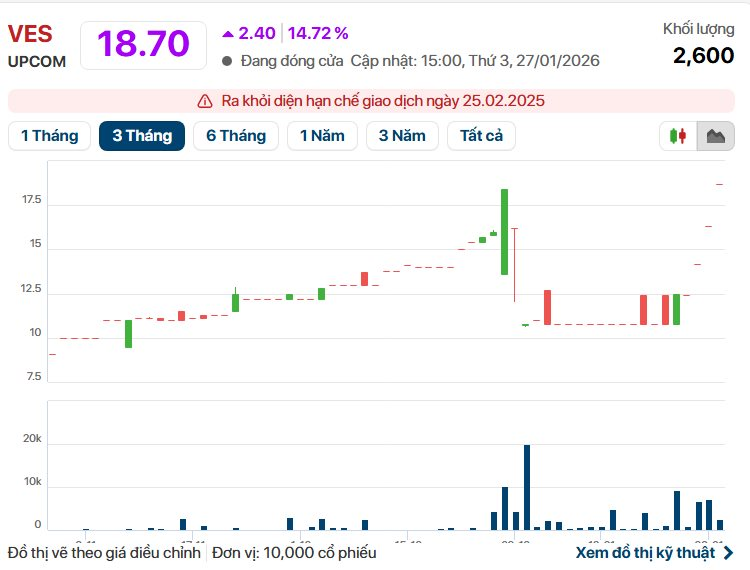 Phiên giao dịch ngày 27/01/2026, trong khi VN-Index chịu áp lực bán tháo và lùi sâu về mốc 1.830 điểm, mã cổ phiếu VES của Công ty Cổ phần Đầu tư và Xây dựng Điện Mê Ca VNECO (sàn UPCoM) tiếp tục trở thành tâm điểm với phiên tăng trần thứ 5 liên tiếp.