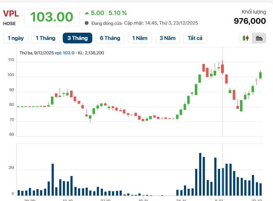 Cùng chiều tích cực, cổ phiếu VPL (Vinpearl) cũng đóng cửa tại mức 103.000 đồng/cp, tăng 5.000 đồng (tương ứng 5,1%) với thanh khoản gần 1 triệu cổ phiếu.