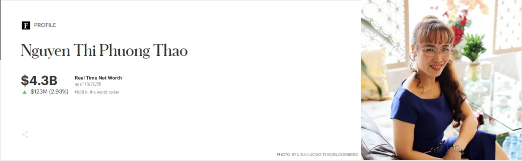 Trên bảng xếp hạng tỷ phú của Forbes, nữ tỷ phú duy nhất của Việt Nam ghi nhận khối tài sản tăng 123 triệu USD lên mức 4,3 tỷ USD, xếp hạng 938 trên thế giới.