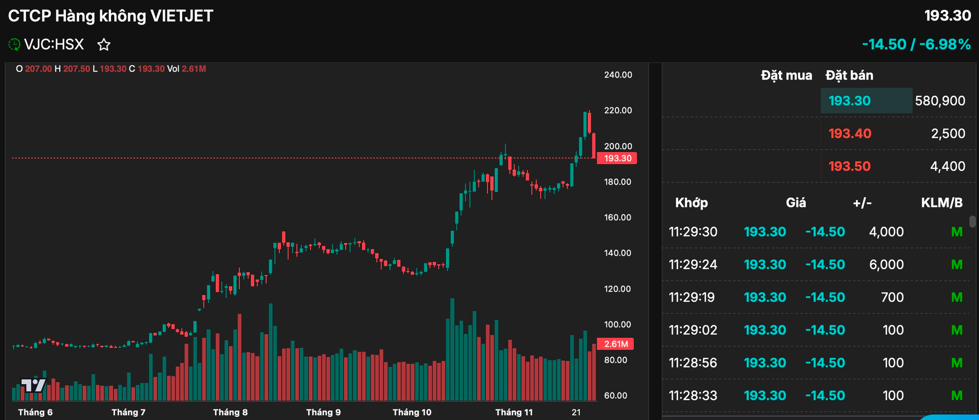 Sau giai đoạn thăng hoa lập đỉnh mới, cổ phiếu Vietjet (VJC) của tỷ phú Nguyễn Thị Phương Thảo quay đầu giảm mạnh. Thậm chí, VJC còn giảm hết biên độ ngày 27/11 với dư bán giá sàn gần 600 nghìn đơn vị tính đến hết phiên sáng. Áp lực chốt lời là một trong những nguyên nhân khi cổ phiếu này trước đó đã tăng hơn gấp đôi từ đầu năm.