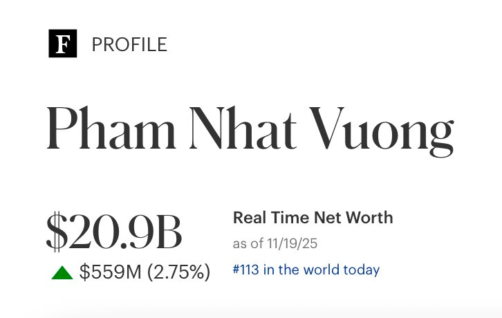 Theo cập nhất từ Forbes, khối tài sản của tỷ phú Phạm Nhật Vượng tính đến ngày 19/11 vào khoảng gần 21 tỷ USD, xếp thứ 116 trong danh sách những người giàu nhất thế giới. Con số này đưa ông Vượng vượt qua Eri Li, Chủ tịch Geely Holding Group – một trong những tập đoàn ô tô lớn nhất Trung Quốc.