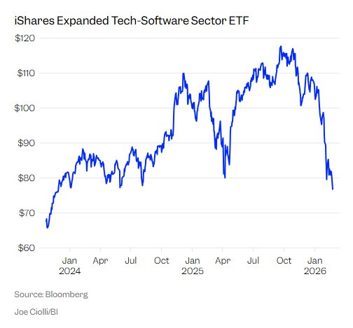 hỉ số iShares Expanded Tech-Software Sector ETF, thước đo sức khỏe của ngành phần mềm, đã bốc hơi 27% kể từ mức đỉnh vào đầu tháng 1/2026.