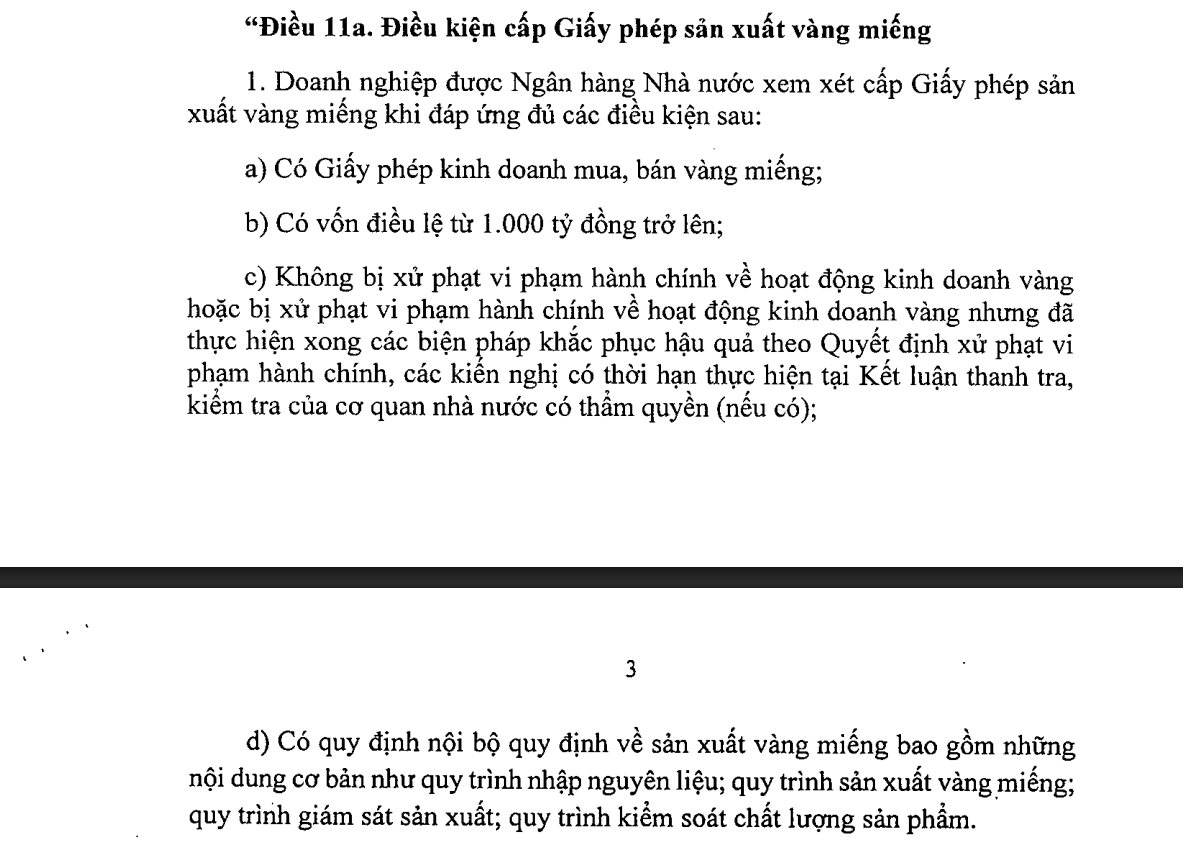 Doanh nghiệp được Ngân hàng Nhà nước xem xét cấp giấy phép sản xuất vàng miếng khi đáp ứng đủ các điều kiện. Cụ thể là doanh nghiệp phải có giấy phép kinh doanh mua, bán vàng miếng; có vốn điều lệ từ 1.000 tỷ đồng trở lên; không bị xử phạt vi phạm hành chính về hoạt động kinh doanh vàng, hoặc bị xử phạt vi phạm hành chính về hoạt động kinh doanh vàng nhưng đã thực hiện xong các biện pháp khắc phục hậu quả theo quyết định xử phạt vi phạm hành chính.