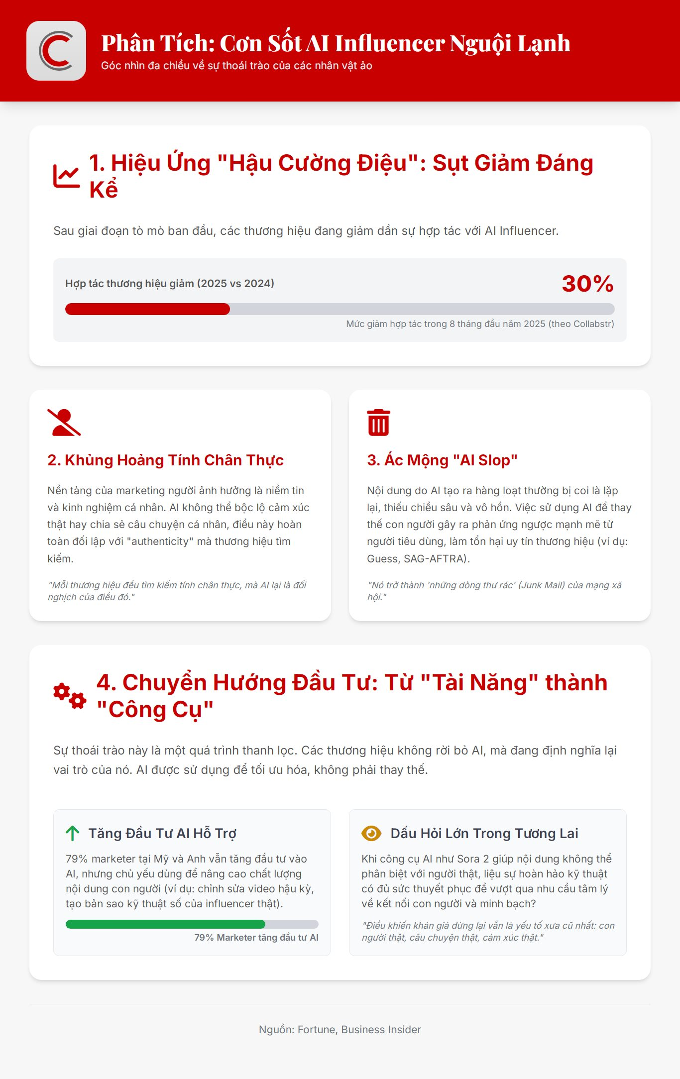 Tệ hơn, việc các nhà sáng tạo nội dung dựa dẫm vào AI đang tạo ra sự lười biếng và ỷ lại, khiến nhiều thương hiệu từng hào hứng với AI influencer giờ lại trở nên dè dặt.