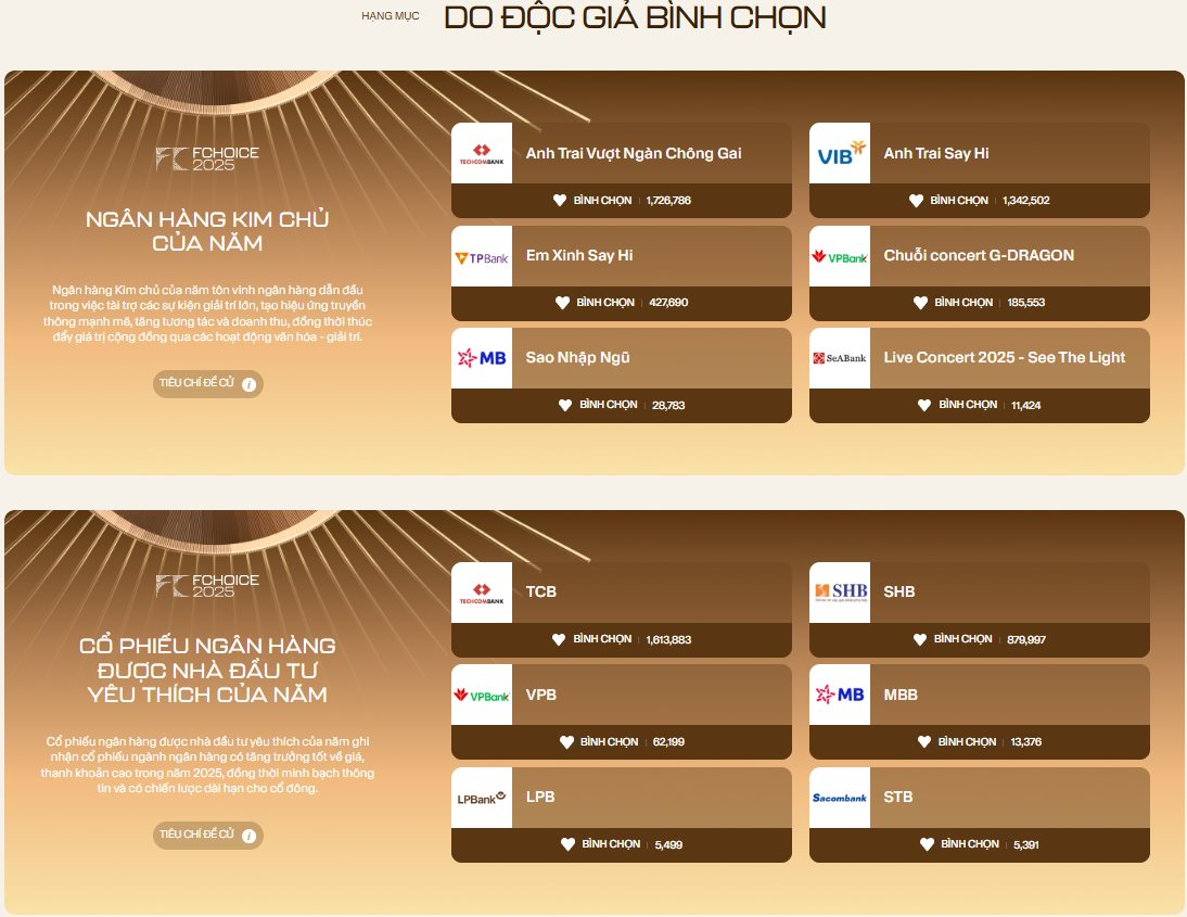 Cổng bình chọn hạng mục “Ngân hàng kim chủ của năm” và “Cổ phiếu ngân hàng được nhà đầu tư yêu thích của năm” tại FChoice vẫn còn mở đến 23h59 ngày 13/12/2025. Liệu có sự bất ngờ nào xảy ra?