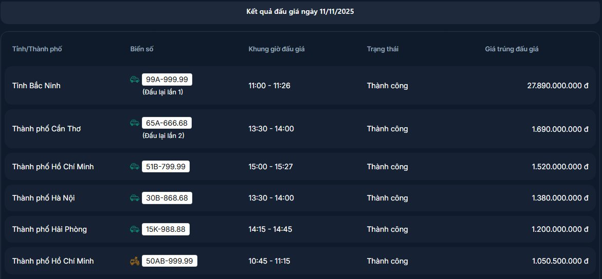 Phiên đấu giá ngày 11/11 cũng ghi nhận nhiều biển số khác được chốt giá ở mức cao, cho thấy một mặt bằng giá trị mới đang được thiết lập: