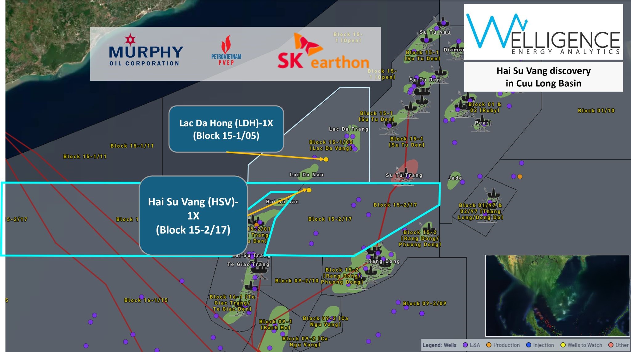 Murphy Oil của Mỹ vừa công bố đã khoan thẩm lượng thành công giếng Hải Sư Vàng - 2X (HSV-2X) tại Lô 15-2/17 thuộc bể Cửu Long, cách bờ biển Việt Nam khoảng 65 km.