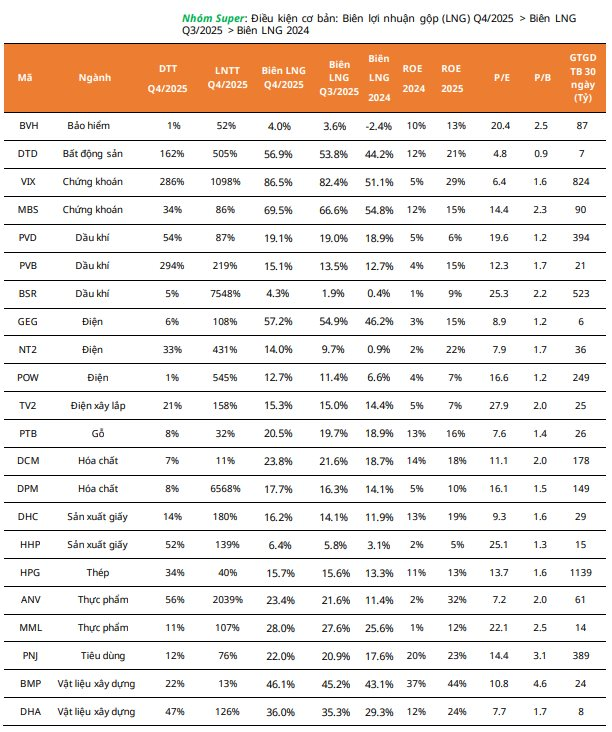 mirae asset="" lọc="" ra="" 22="" cổ="" phiếu="" nhóm="" "super"="" -="" "siêu="" phiếu"="" với="" Điều="" kiện="" cơ="" bản:="" biên="" lợi="" nhuận="" gộp="" (lng)="" q4="" 2025=""> Biên LNG Q3/2025 > Biên LNG 2024. Trong đó, có thể kể tới là các doanh nghiệp thuộc nhóm chứng khoán (VIX, MBS), dầu khí (PVD, PVB, BSR); ĐIỆN ( GEG, NNT2, POW)...