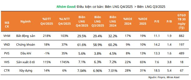 Ngoài ra, đội ngũ phân tích cũng đưa ra danh sách 5 cổ phiếu "Good" - tốt với Điều kiện cơ bản: Biên LNG Q4/2025 > Biên LNG Q3/2025, gồm VHM, VND, PVS, VVS, CTR