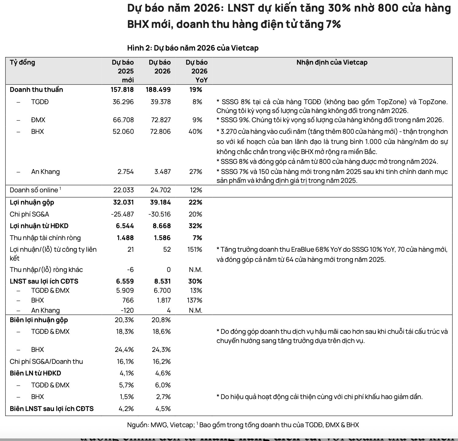 Bước sang 2026, đà tăng trưởng được kỳ vọng tiếp tục lan tỏa khi MWG lên kế hoạch mở thêm 800 cửa hàng BHX, nâng tổng số điểm bán lên khoảng 3.270 cửa hàng trên toàn quốc. Vietcap dự báo doanh thu năm 2026 đạt 188.499 tỷ đồng, tăng 19%, trong khi lợi nhuận sau thuế có thể đạt 8.531 tỷ đồng, tăng thêm 30% so với nền cao của năm 2025.
