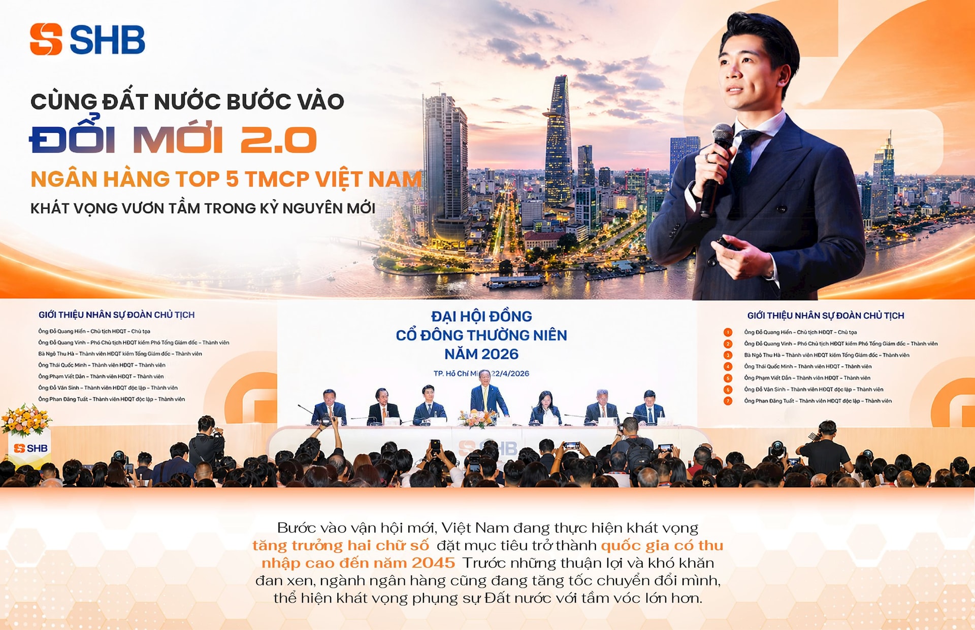 Với những yêu cầu lớn của thời đại, SHB quyết định chuyển đổi toàn diện, không chỉ nằm ở bộ nhận diện thương hiệu, mà còn nằm ở chính nội tại bên trong. Trước gần 3.000 cổ đông, ông Đỗ Quang Vinh chia sẻ về một hành trình dài hạn, một thời khắc mang tính chuyển đổi của SHB sau gần 33 năm với định hướng: “Ngân hàng tầm vóc quốc gia thế hệ mới”.