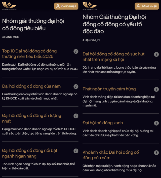 AGM Awards 2026 do CafeF phối hợp cùng VIOD tổ chức, tôn vinh các doanh nghiệp có hoạt động tổ chức Đại hội cổ đông minh bạch, hiệu quả và sáng tạo. Giải thưởng ra đời trong bối cảnh thị trường chứng khoán Việt Nam đang tiến gần tới mục tiêu nâng hạng, qua đó trở thành một thước đo uy tín giúp nhận diện những doanh nghiệp có nền tảng quản trị tốt và hướng tới chuẩn mực quốc tế.