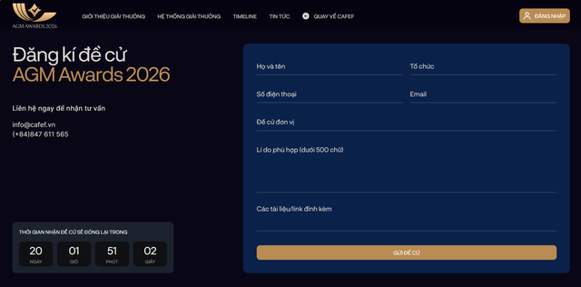 Theo kế hoạch, AGM Awards 2026 tiếp tục nhận hồ sơ đề cử và tự đề cử đến hết ngày 15/05/2026. Đây là khoảng thời gian quan trọng để các doanh nghiệp hoàn thiện thông tin và chính thức ghi danh vào cuộc đua.
