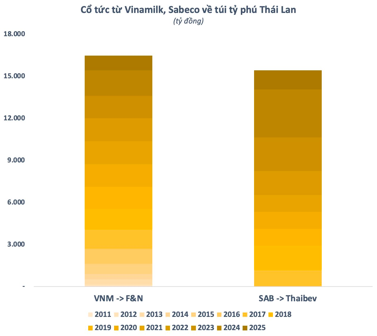 Đó là ở thì tương lai. Còn trước mắt, với việc gia tăng đáng kể tỷ lệ sở hữu, nhóm F&N có thể bỏ túi thêm hàng trăm tỷ đồng mỗi năm từ cổ tức của Vinamilk. Tính đến thời điểm hiện tại, doanh nghiệp đầu ngành Sữa cũng chính là cái tên mang về cho tỷ phú Charoen Sirivadhanabhakdi nhiều tiền cổ tức nhất tại Việt Nam, với khoảng 16.500 tỷ đồng. Con số này với Sabeco là khoảng 15.500 tỷ đồng.