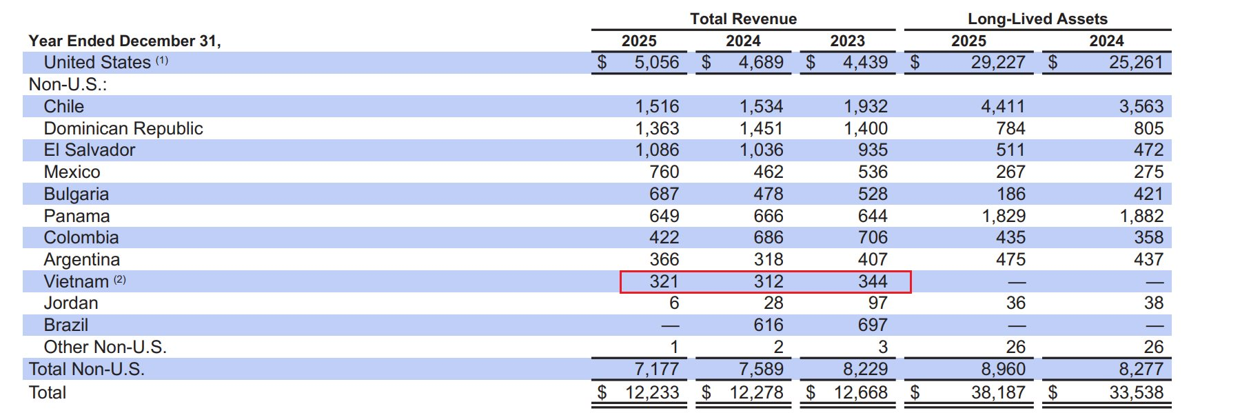 Báo cáo cho thấy doanh thu của AES tại Việt Nam năm 2025, toàn bộ đến từ nhà máy nhiệt điện Mông Dương 2, là 321 triệu USD, tương đương 8.456 tỷ đồng. Con số này không khác biệt lớn với kết quả 312 triệu USD năm 2024 và 344 triệu USD năm 2023.