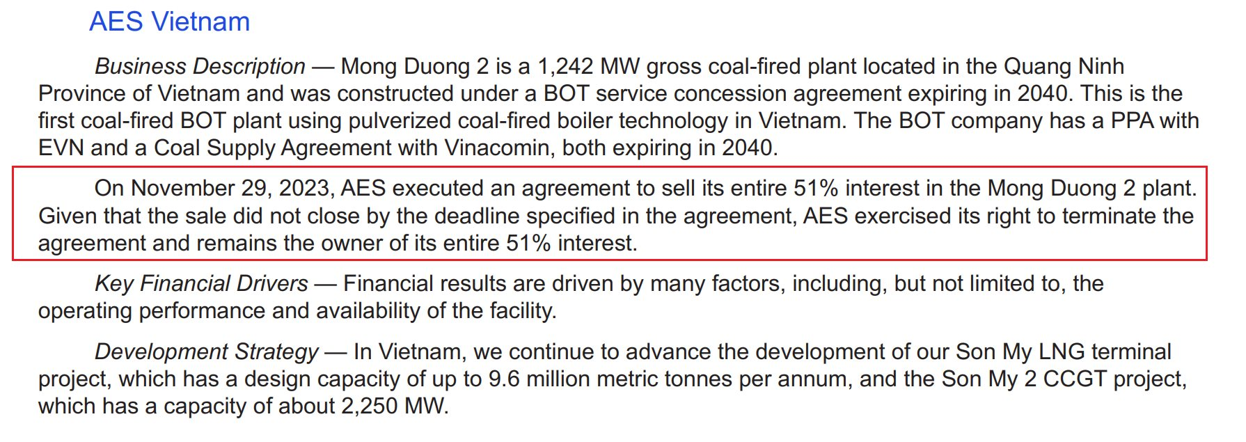 Một diễn biến lớn liên quan tới nhà máy điện than này bắt đầu từ năm 2023, khi đó, AES thông báo đã đạt được thỏa thuận bán 51% cổ phần của mình tại Mông Dương 2 cho Se.ven Global Investments, một doanh nghiệp có trụ sở tại Cộng hòa Séc.