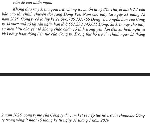 Trong báo cáo kiểm toán do Công ty TNHH PwC (Việt Nam) thực hiện, các kiểm toán viên đã đưa ra vấn đề cần nhấn mạnh là khoản lỗ lũy kế 21.567 tỷ đồng và nợ ngắn hạn của công ty đã vượt quá tài sản ngắn hạn hơn 8.552 tỷ đồng. Sự kiện này cho thấy sự hiện hữu của yếu tố không chắc chắn có tính trọng yếu, dẫn đến sự hoài nghi về khả năng hoạt động liên tục của doanh nghiệp.