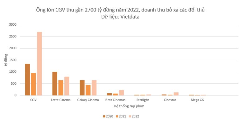 Theo dữ liệu của Vietdata, trong các năm từ 2020-2022, doanh thu của CVG và Lotte vẫn luôn dẫn đầu thị trường phòng vé Việt, tập trung ở 2 thành phố lớn. Trong khi đó, phần đông khán giả ở tỉnh vẫn bị giới hạn lựa chọn về thương hiệu và trải nghiệm.