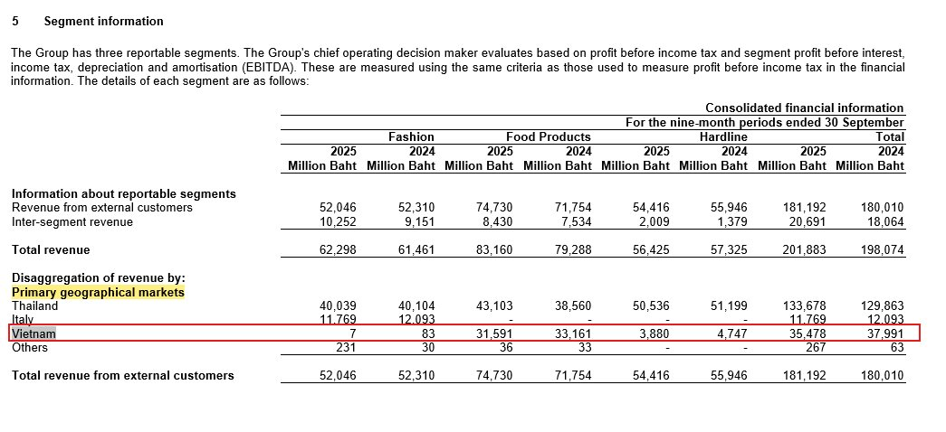 Cụ thể, tại mục báo cáo bộ phận, doanh thu mảng Điện máy tại Việt Nam trong 9 tháng đầu năm 2024 đạt 4.747 triệu Baht. Tuy nhiên, sang đến 9 tháng đầu năm 2025, con số này giảm xuống còn 3.880 triệu Baht.