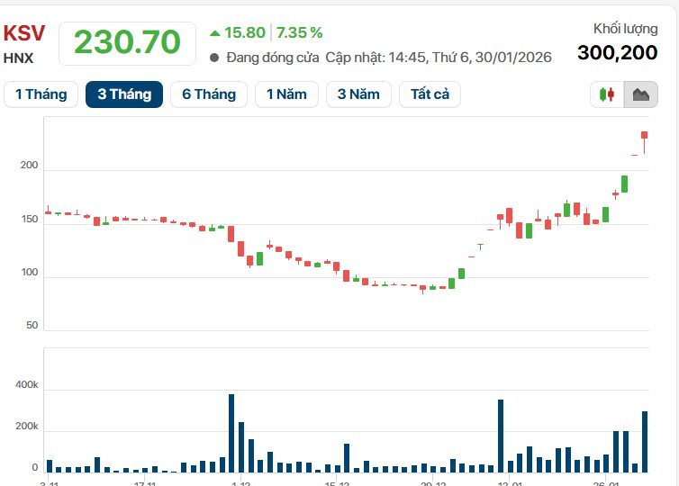 Cổ phiếu KSV trên thị trường chứng khoán đã có nhịp tăng phi mã. Kết thúc phiên giao dịch ngày 30/1/2026, thị giá KSV đóng cửa tại mức 230.700 đồng/cổ phiếu, tăng 7,35% so với tham chiếu cùng thanh khoản hơn 300.000 đơn vị.